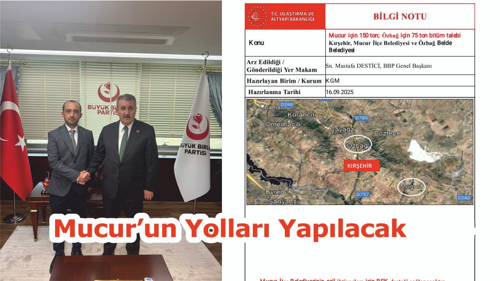 “Sayın genel başkanımız mustafa destici’nin öncülüğünde ulaştırma ve alt yapı bakanlığımız tarafından 16.09.2025 tarihinde mucur içi asfalt çalışması için